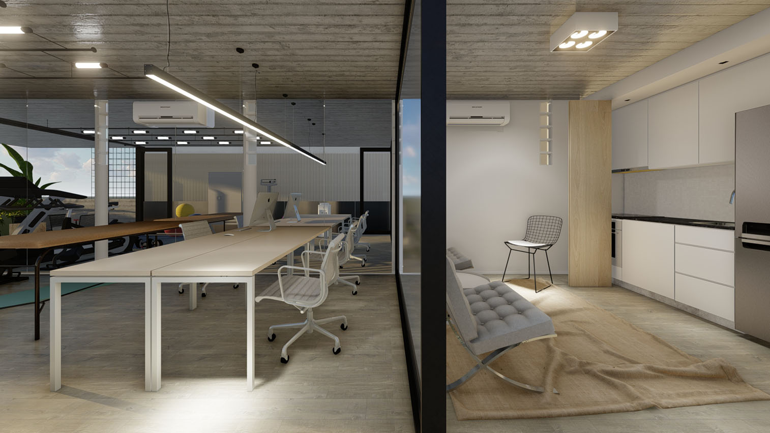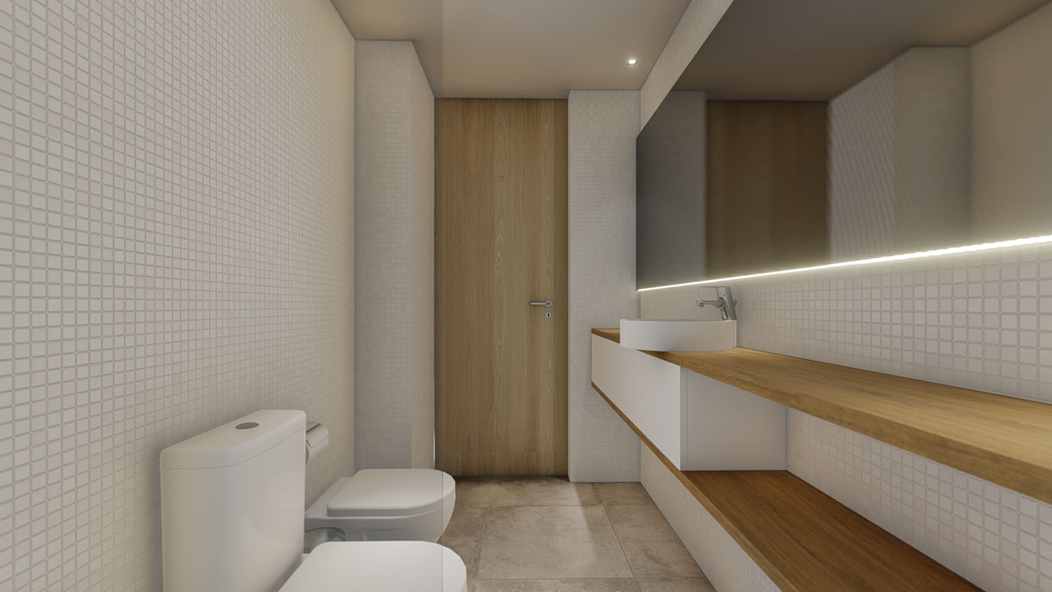 Hacia la calle, dos niveles de departamentos de 3 ambientes y una unidad de doble altura definen la volumetría. En el contrafrente, seis unidades de 2 ambientes espejadas y encastradas maximizan el espacio, culminando en un semipiso de 4 ambientes con curtain wall y visuales abiertas. Dos penthouses con terrazas, piscina y espacios de expansión coronan el edificio con identidad propia.