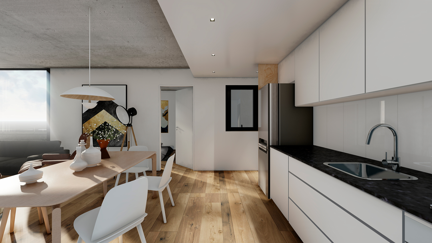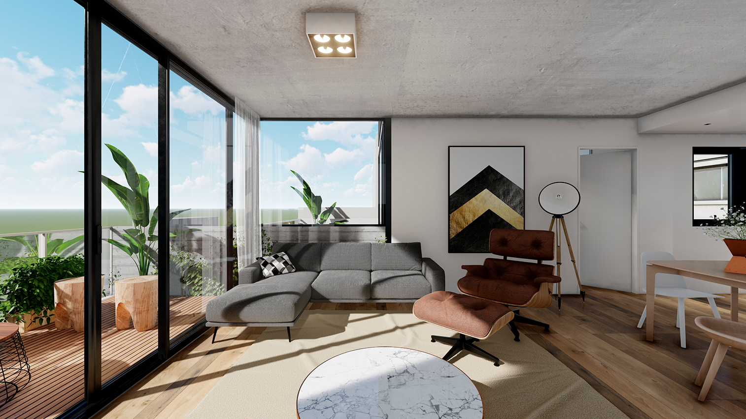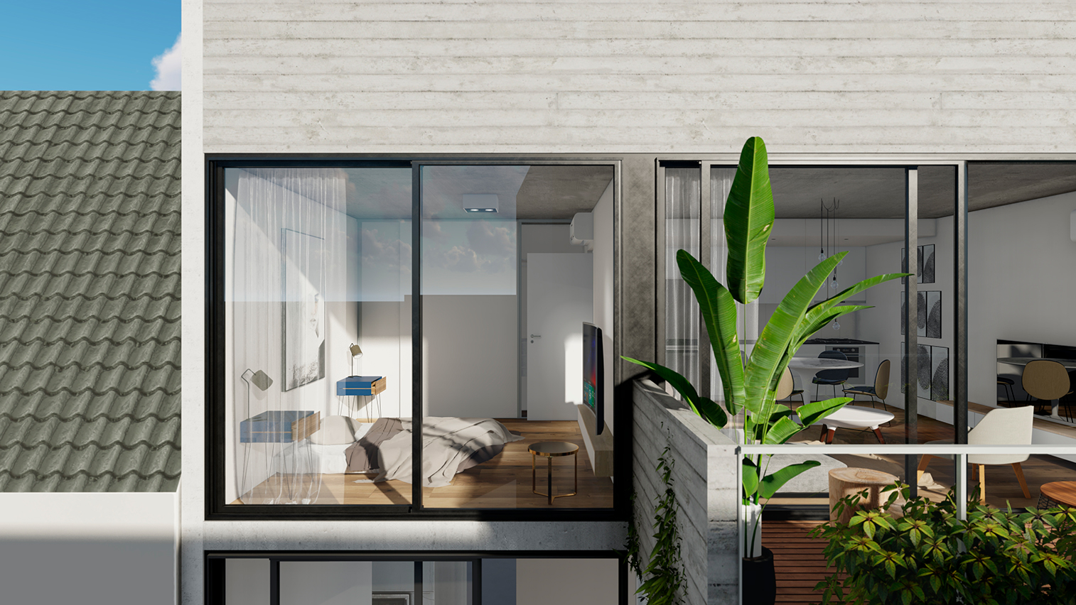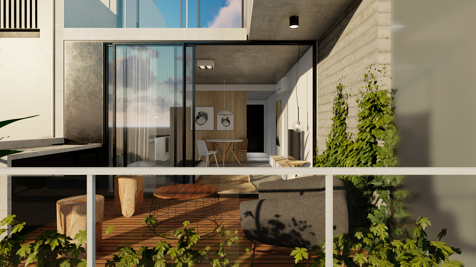 Hormigón visto, planos claros y terminaciones de calidad definen su carácter. El edificio se completa con amenities que amplifican la experiencia: espacios comunes que extienden el habitar y refuerzan la idea de comunidad urbana.
