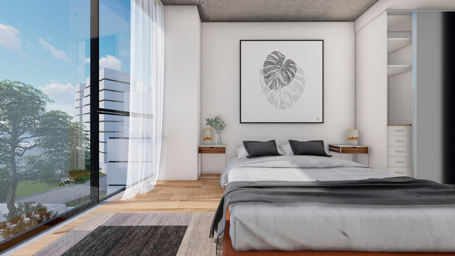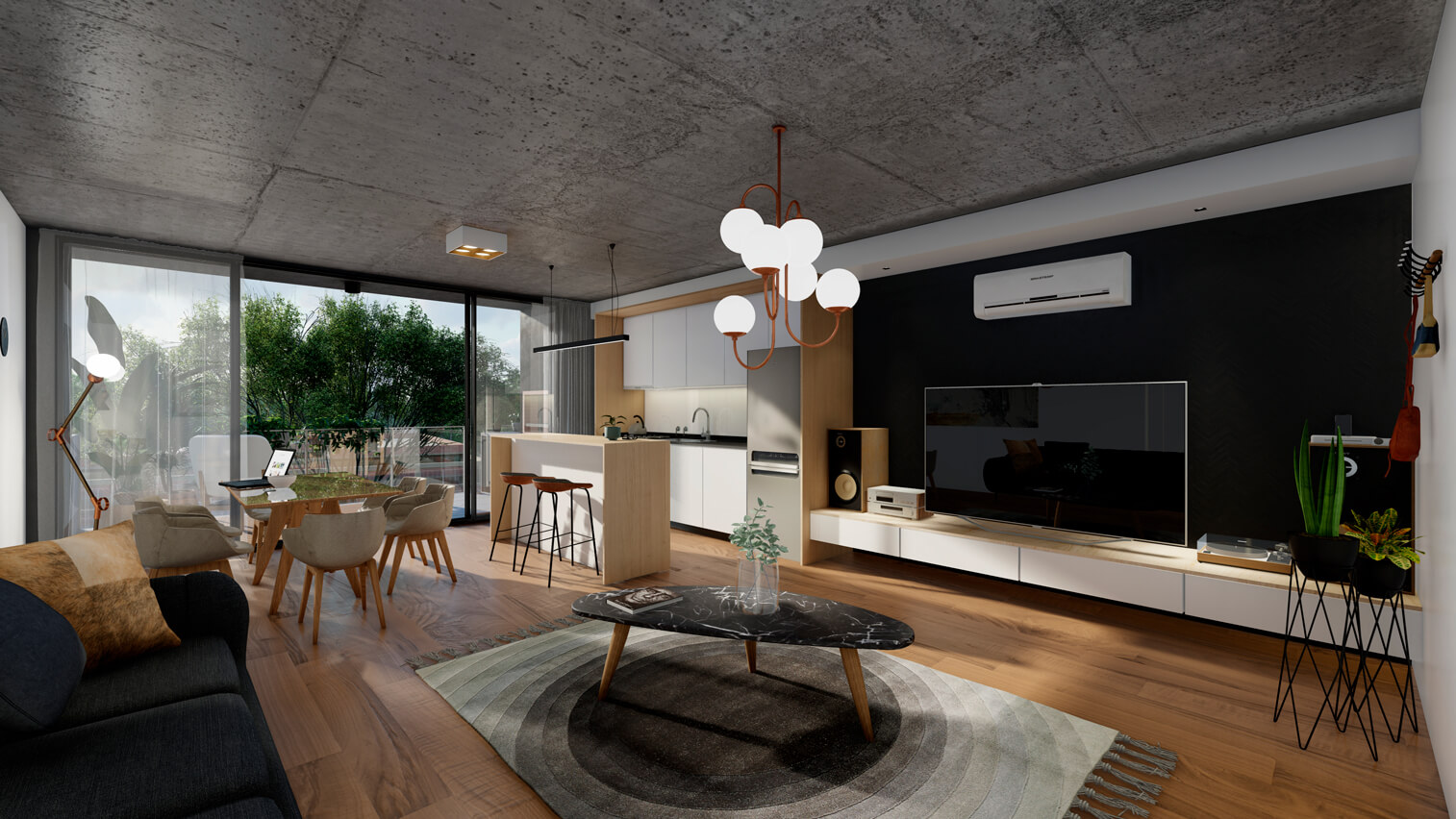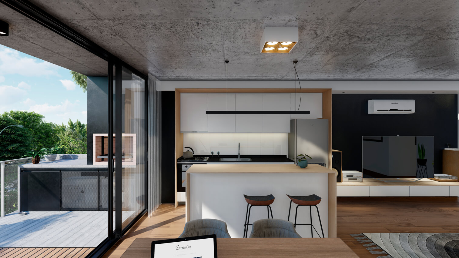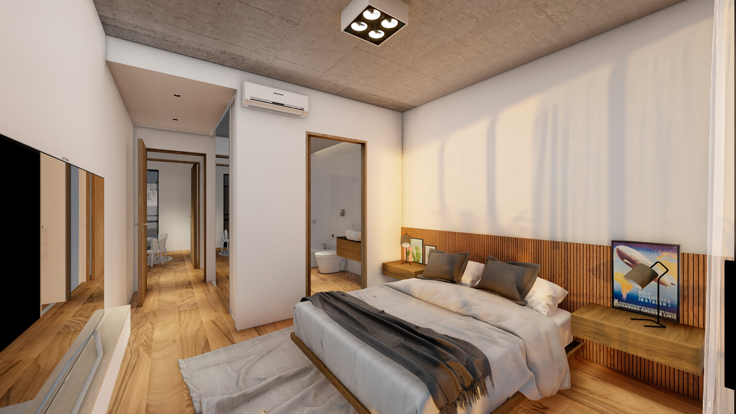 El edificio cuenta con 12 unidades funcionales de 1, 2, 3 y 4 ambientes, diseñadas con expansiones amplias, balcones con parrillas y espacios que maximizan la luz y la circulación del aire. La materialidad combina muros blancos, pisos de porcellanato símil madera y losas de hormigón visto, generando una estética contemporánea y flexible que se adapta al estilo de vida de cada habitante.