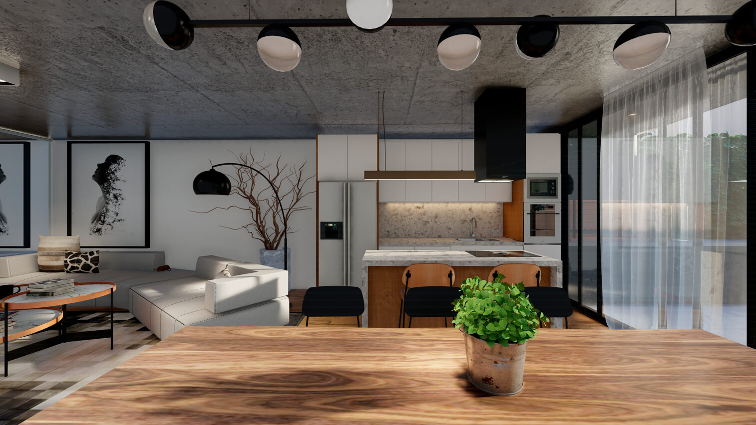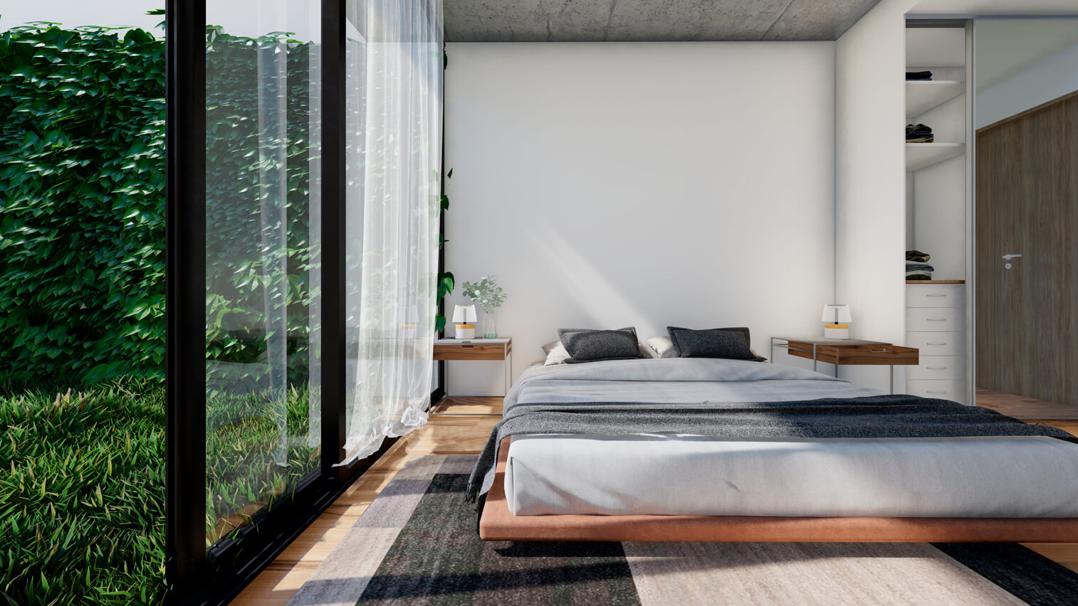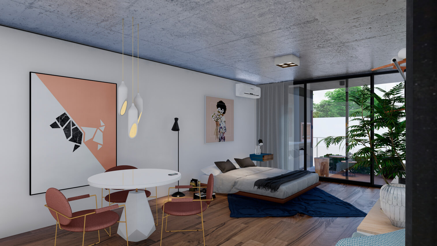 El edificio cuenta con 12 unidades funcionales de 1, 2, 3 y 4 ambientes, diseñadas con expansiones amplias, balcones con parrillas y espacios que maximizan la luz y la circulación del aire. La materialidad combina muros blancos, pisos de porcellanato símil madera y losas de hormigón visto, generando una estética contemporánea y flexible que se adapta al estilo de vida de cada habitante.