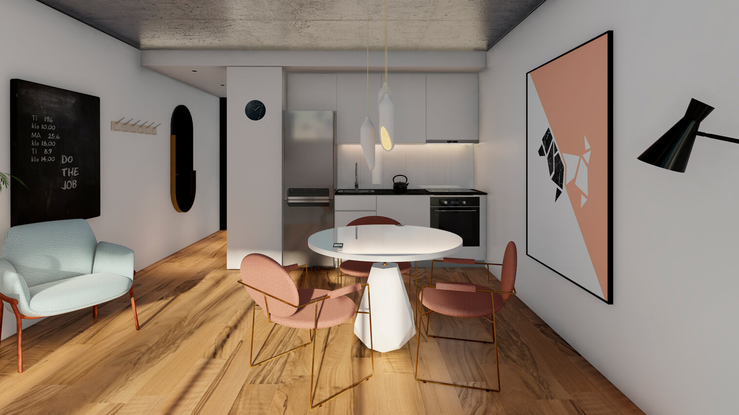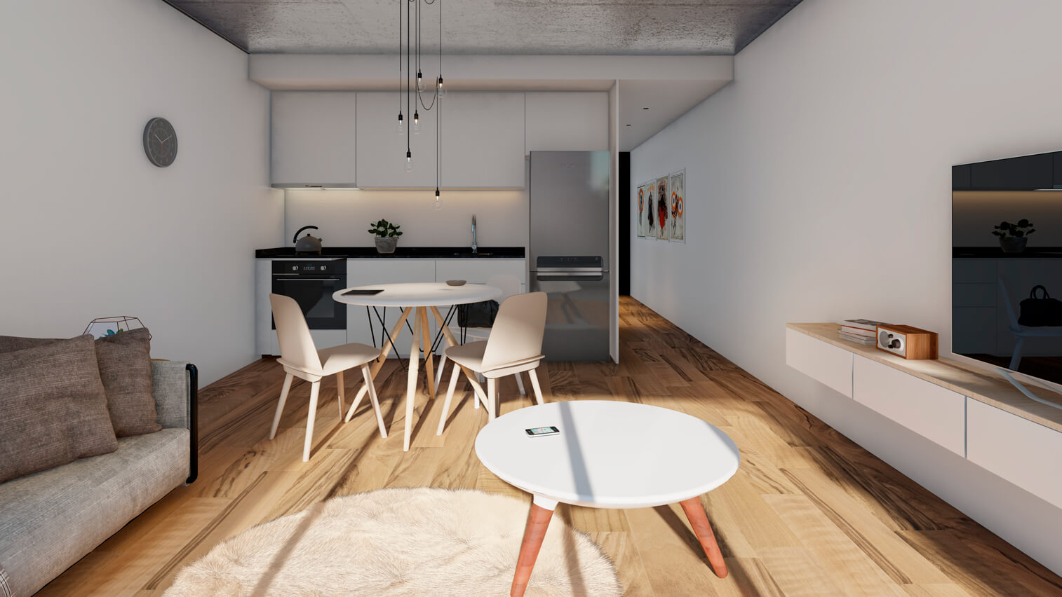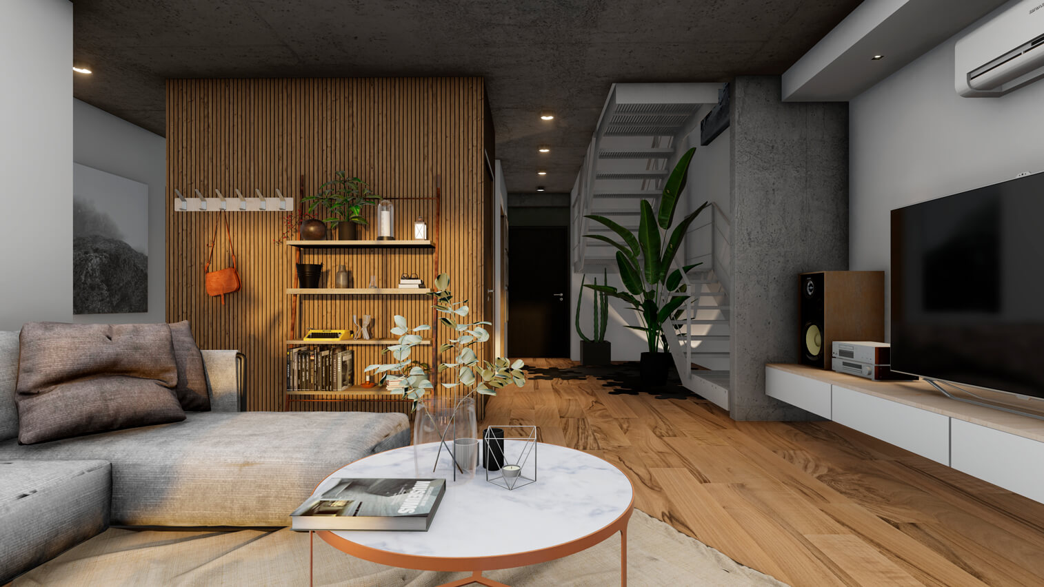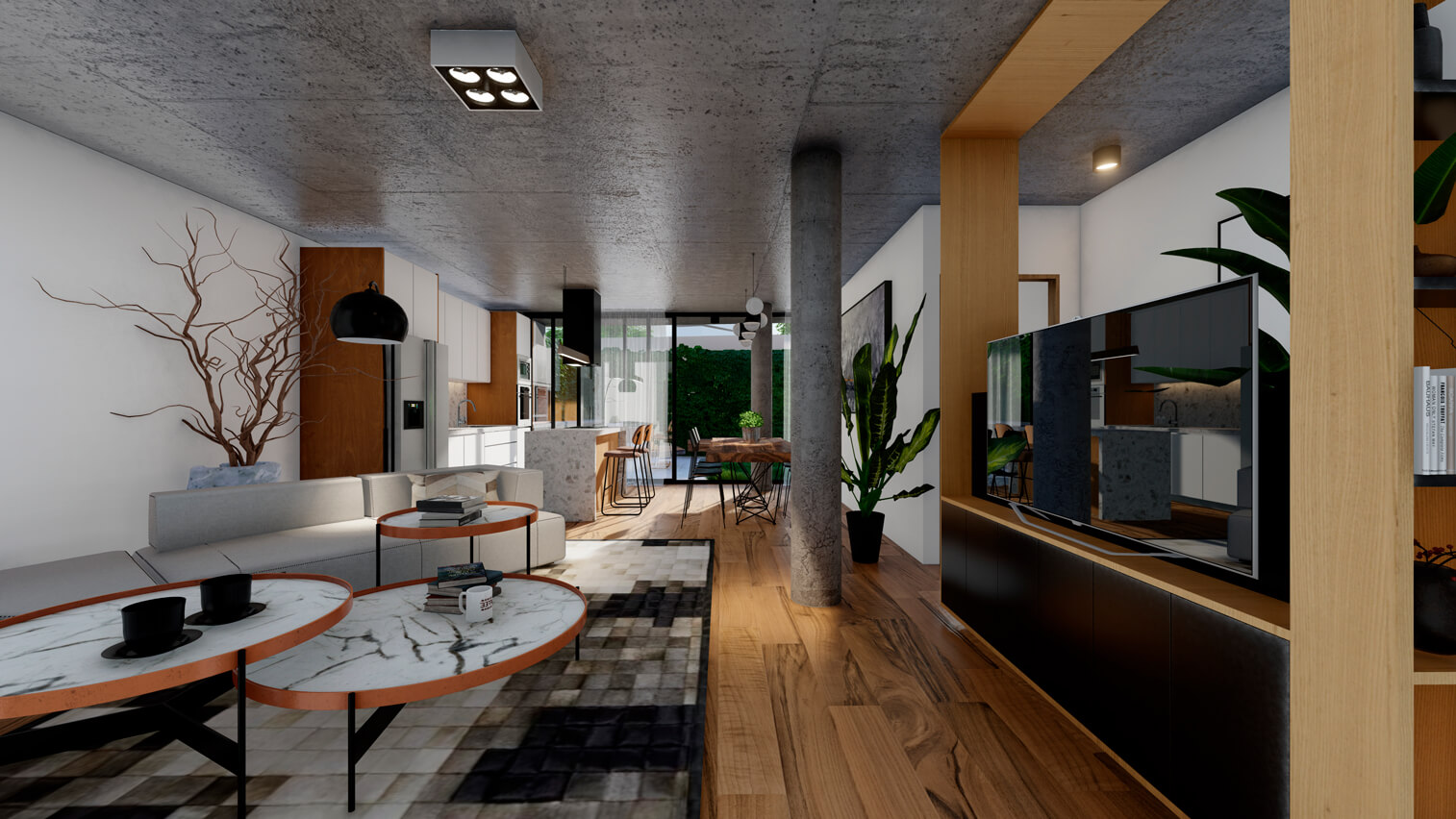 El edificio cuenta con 12 unidades funcionales de 1, 2, 3 y 4 ambientes, diseñadas con expansiones amplias, balcones con parrillas y espacios que maximizan la luz y la circulación del aire. La materialidad combina muros blancos, pisos de porcellanato símil madera y losas de hormigón visto, generando una estética contemporánea y flexible que se adapta al estilo de vida de cada habitante.