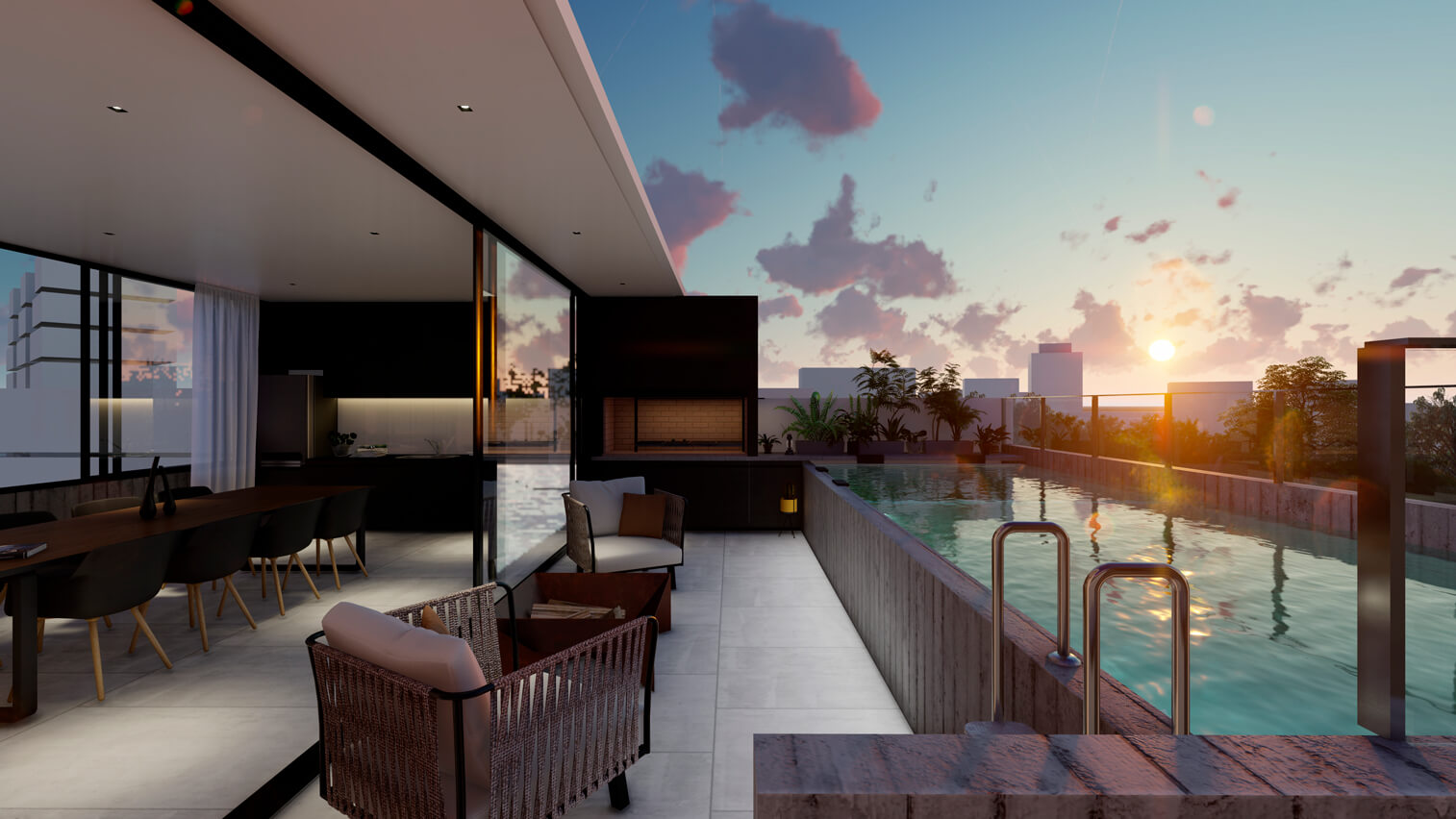 El proyecto se distingue por sus penthouses: una “casa en altura” con vistas privilegiadas a la plaza, piscina y terrazas privadas, y un semipiso aterrazado al contrafrente que completa la volumetría con carácter único. Ambos coronan el edificio con espacios generosos, pensados para disfrutar tanto de la intimidad como del paisaje urbano.