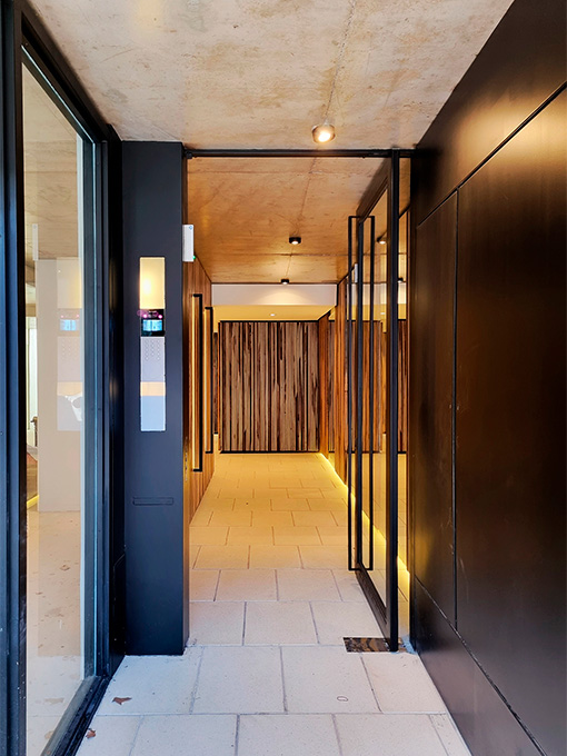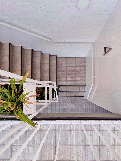 El edificio reúne 14 unidades de 1, 2 y 3 ambientes, organizadas en dos volúmenes sobre una planta baja libre destinada a cocheras. Cada departamento está pensado para adaptarse al estilo de vida de sus habitantes: muros blancos, porcellanato y hormigón visto generan un lienzo neutro sobre el cual cada usuario imprime su sello.