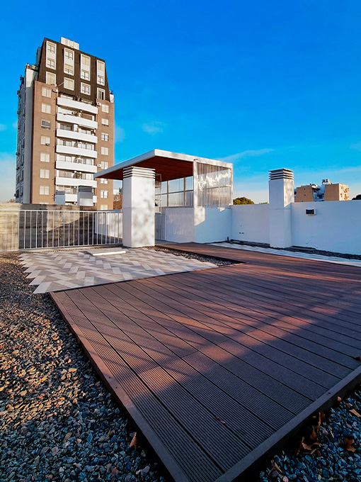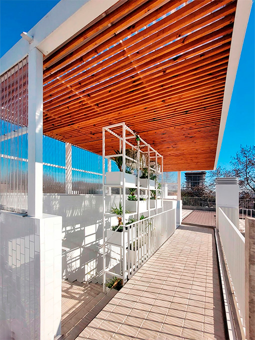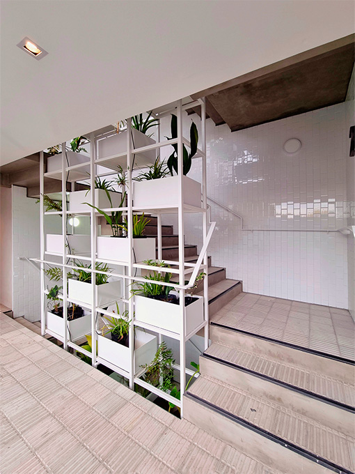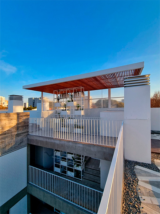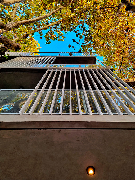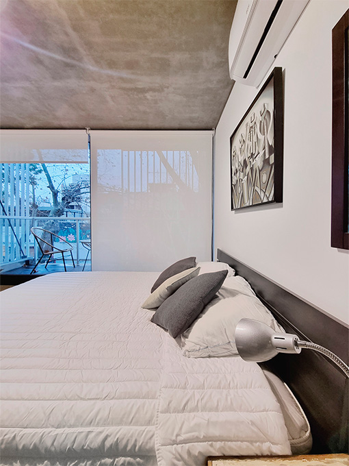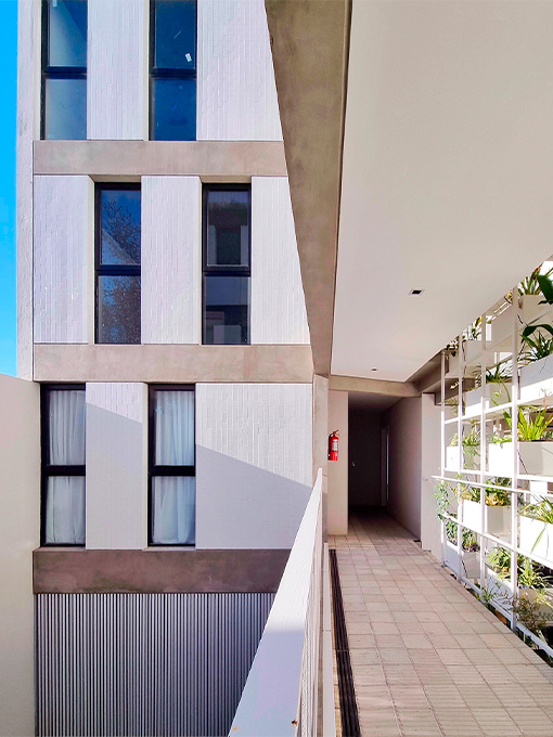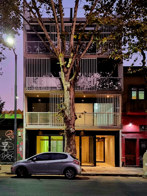 La fachada combina hormigón visto, planos blancos y parasoles de impronta industrial que filtran la luz y eligen el grado de apertura hacia la ciudad. Un gesto que aporta dinamismo al frente y refleja la identidad de Palermo: ecléctica, cambiante, siempre en movimiento.<br />